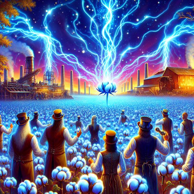 ChatGPT: Generate an image of a vibrant steampunk world where electric blue cotton plants crackle with energy, illuminating the landscape of a field in Georgia. In the distance, farmers in steampunk attire look on in awe at the electrifying scene. The air crackles with sparks, and a sense of innovation and excitement fills the atmosphere. The image should capture the fusion of steampunk aesthetics with the electrifying energy of the cotton plants, creating a visually compelling and immersive scene.