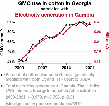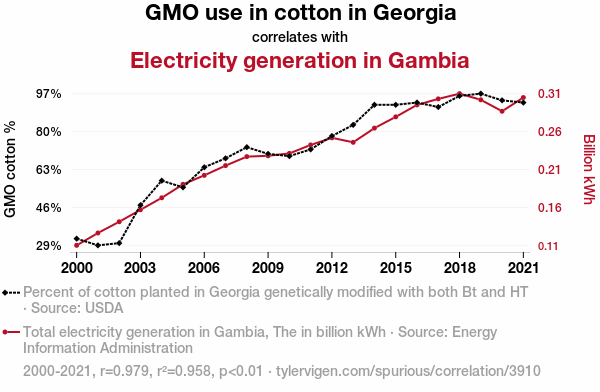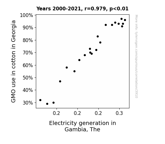 This means 95.8% of the change in the one variable (i.e., Electricity generation in Gambia) is predictable based on the change in the other (i.e., GMO use in cotton in Georgia) over the 22 years from 2000 through 2021.