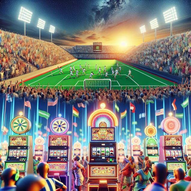 ChatGPT: Generate an image of a vibrant field hockey stadium filled with jubilant fans as the victorious team celebrates their win. The scoreboard prominently displays the high score. Adjacent to the stadium, set the scene in Las Vegas with a cluster of colorful and dynamic slot machines, their lights flickering and reels spinning, emanating an atmosphere of excitement and chance. Capture the contrast between the fervor of the sports event and the electric energy of the casino, evoking the magical realism in the merging of these disparate worlds.