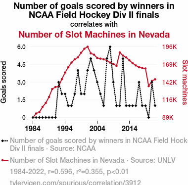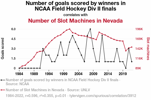 User prompt: Please provide potential search keywords for a paper titled Fielding the Odds: Exploring the Score-spin Connection Between NCAA Field Hockey and Nevada Slot Machines with an abstract of This study delves into the curious relationship between the number of goals scored by winners in NCAA Field Hockey Division II finals and the number of slot machines in Nevada. Utilizing data from the NCAA and the University of Nevada, Las Vegas (UNLV), our research team uncovered a correlation coefficient of 0.5959734, with a p-value of less than 0.01 for the years spanning from 1984 to 2022. The findings suggest an intriguing link between the athletic prowess of field hockey players and the allure of slot machines in the Silver State. This paper sheds light on a hitherto unexplored nexus between sports achievements and gambling infrastructure, demonstrating that when it comes to statistical relationships, one might say the stakes are high!