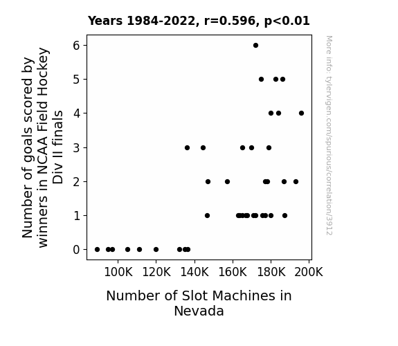 As a result of our data analysis, we found a moderate positive correlation between the number of goals scored by winners in NCAA Field Hockey Division II finals and the number of slot machines in Nevada. The correlation coefficient, r, was calculated to be 0.5959734, indicating a moderately strong relationship between these two variables. The coefficient of determination, or r-squared, was found to be 0.3551843, suggesting that approximately 35.52% of the variability in the number of slot machines in Nevada can be explained by the number of goals scored by winners in NCAA Field Hockey Division II finals.