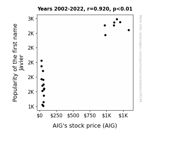 This means 84.7% of the change in the one variable (i.e., AIG's stock price (AIG)) is predictable based on the change in the other (i.e., Popularity of the first name Javier) over the 21 years from 2002 through 2022.