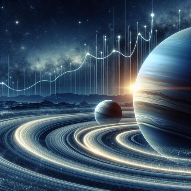Prompt: [Realistic] An image of the solar system with a focus on Neptune and Uranus slowly drifting apart, with the immense vastness of space surrounding them. A visual depiction of the celestial bodies' movements creating a ripple effect across the universe, symbolizing the interconnectedness of celestial events with earthly affairs. In the background, a subtle representation of Novo Nordisk's stock price soaring, symbolizing the surge in investor interest in the company's diabetes and obesity products, creating a subtle visual link between the cosmic dance of planets and the movement of financial markets. The depiction should include only scenes, people, and objects, it should not include text or speech bubbles.