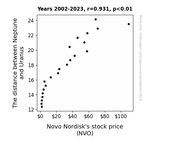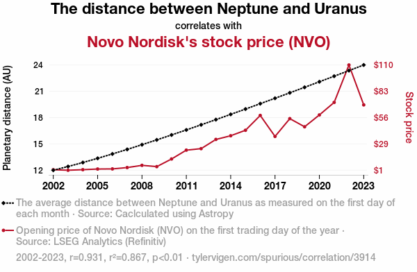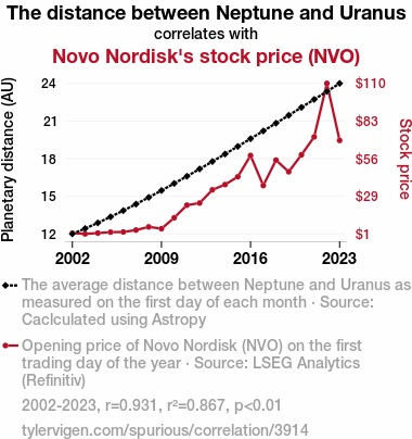 - The spurious research paper: Planetary Proximity and Pharma Fortunes: Unveiling the Influence of Neptune-Uranus Distance on Novo Nordisk Stock Price