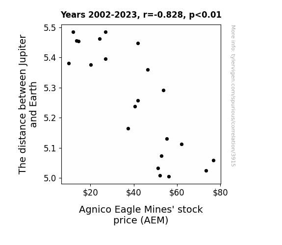 Analyzing data from 2002 to 2023, our research team uncovered a surprisingly strong negative correlation between the distance separating Jupiter and Earth and the stock price of AEM, with a correlation coefficient of -0.8284866 and a p-value < 0.01. These findings suggest a tantalizing link between the vast expanse of outer space and the earthly realm of stock market fluctuations.