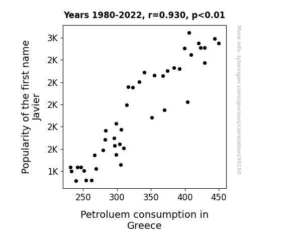 This means 86.5% of the change in the one variable (i.e., Petroluem consumption in Greece) is predictable based on the change in the other (i.e., Popularity of the first name Javier) over the 43 years from 1980 through 2022.