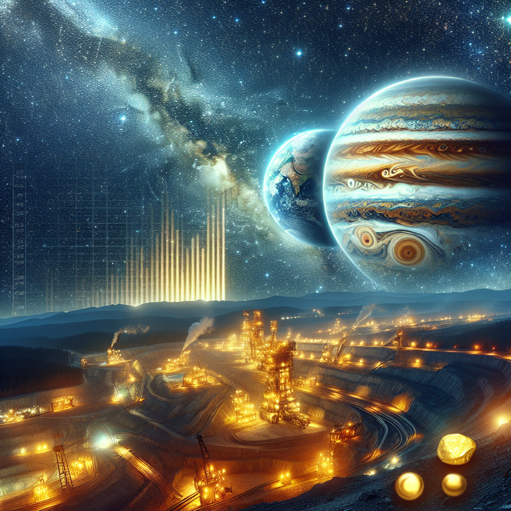 Prompt: [ A photo-realistic image ] Show the vast night sky with stars twinkling above as Jupiter and Earth draw closer together. Below, a mining site at Agnico Eagle Mines emits a soft glow, with illuminated equipment lined up. As the planets approach, the surface of the mining site is dotted with gleaming gold nuggets, their shine accentuated by the moonlight. Nearby, a bar graph visually represents the steady upward climb of the stock price of Agnico Eagle Mines, reflecting the increasing value of the precious metal being unearthed. The depiction should include only scenes, people, and objects, it should not include text or speech bubbles.