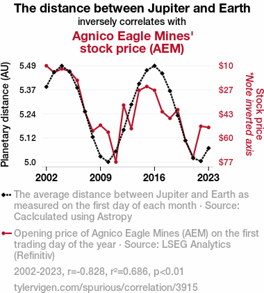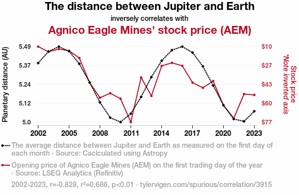This means 68.6% of the change in the one variable (i.e., Agnico Eagle Mines' stock price (AEM)) is predictable based on the change in the other (i.e., The distance between Jupiter and Earth) over the 22 years from 2002 through 2023.
