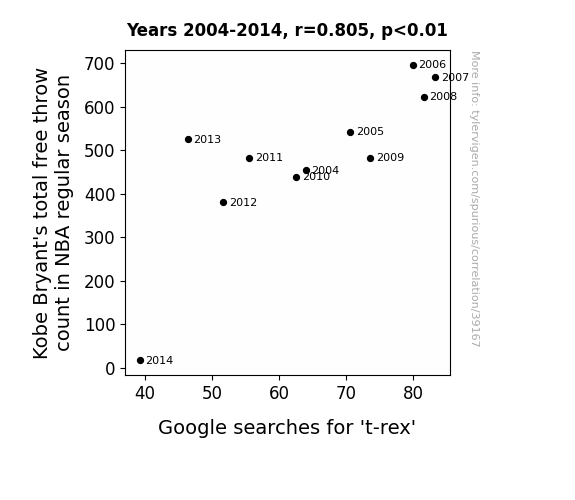 This means 64.8% of the change in the one variable (i.e., Google searches for 't-rex') is predictable based on the change in the other (i.e., Kobe Bryant's total free throw count in NBA regular season) over the 11 years from 2004 through 2014.