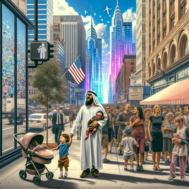 User prompt: Please respond with an image generation prompt that would be likely to create an interesting visual using DALLE-3, using the following style: [ Parallax art ] and depicting this scene: In a bustling city, parents walk along the sidewalks, pushing strollers and admiring the latest trend in baby names. A father smiles proudly as he holds his son, Harrison, named after the famous actor Harrison Ford. Nearby, a line forms outside a hat shop, where fedoras are flying off the shelves. Meanwhile, in the distance, the stock ticker displays a sharp rise in Bristol-Myers Squibb's stock price, reflecting the increased demand for snake bite antivenom, as the company is the leading supplier. Keep the visual depiction simple. Do not include any words or speech bubbles.