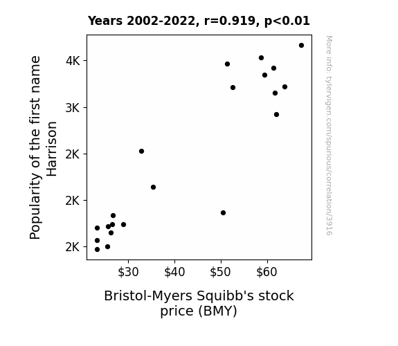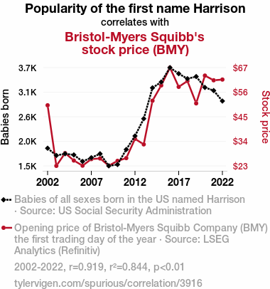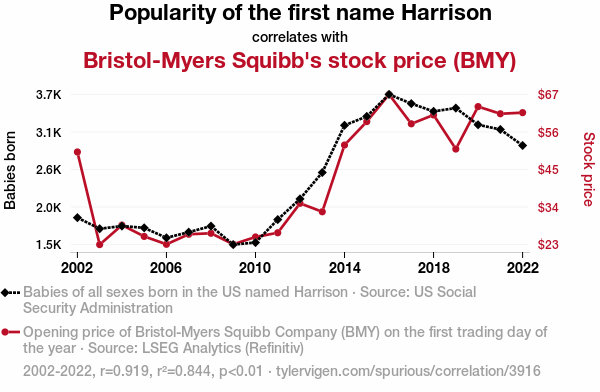 This increase could be because anyone named Harrison is actually a secret genius at biopharmaceutical investing, leading to a surge of Harrison-named individuals investing heavily in Bristol-Myers Squibb. Or possibly, there's a Harrison out there who accidentally discovered the elixir of stock price growth, and as more and more kids were named after him, the effect compounded, much like the interest on a savvy investment.