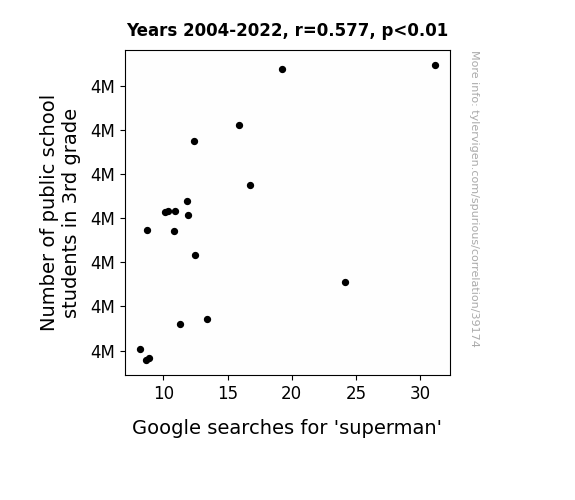 This means 33.3% of the change in the one variable (i.e., Google searches for 'superman') is predictable based on the change in the other (i.e., Number of public school students in 3rd grade) over the 19 years from 2004 through 2022.