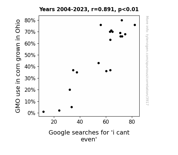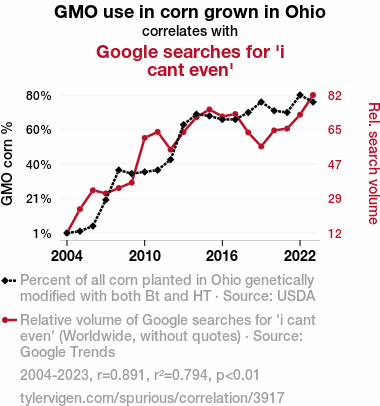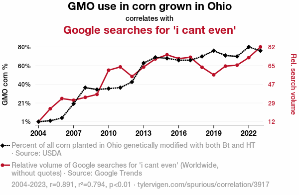 This means 79.4% of the change in the one variable (i.e., Google searches for 'i cant even') is predictable based on the change in the other (i.e., GMO use in corn grown in Ohio) over the 20 years from 2004 through 2023.