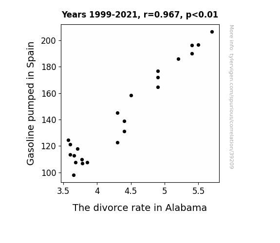 This means 93.5% of the change in the one variable (i.e., The divorce rate in Alabama) is predictable based on the change in the other (i.e., Gasoline pumped in Spain) over the 23 years from 1999 through 2021.