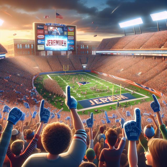 ChatGPT: Create an image that resembles a scene from a Disney movie, showcasing a bustling football stadium packed with enthusiastic fans cheering for the New England Patriots. The stadium is adorned with a massive banner displaying the name "Jeremiah," while the team's scoreboard illuminates with a high score. The crowd is depicted joyously celebrating, many brandishing foam fingers adorned with the name "Tom Brady," linking the team's success with the popularity of the name Jeremiah. The visual portrayal should capture the electric atmosphere, bustling energy, and triumphant spirit of the stadium.