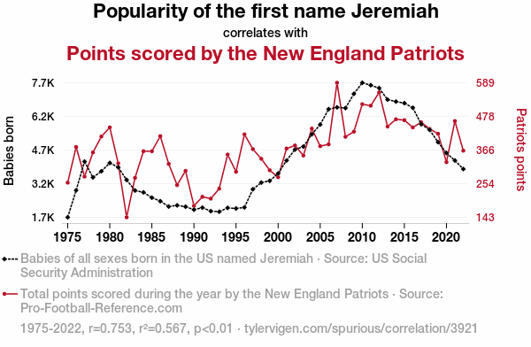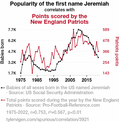 - The spurious research paper: Jeremiah's Touchdown: The Correlation Between the Popularity of the Name Jeremiah and the Points Scored by the New England Patriots