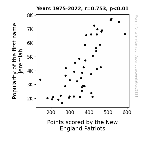 (Scatterplot showing the strong correlation between the prevalence of the name Jeremiah and the points scored by the New England Patriots)