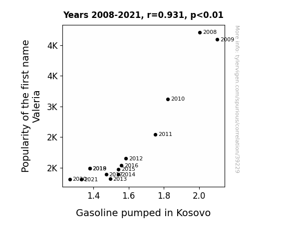 This means 86.7% of the change in the one variable (i.e., Gasoline pumped in Kosovo) is predictable based on the change in the other (i.e., Popularity of the first name Valeria) over the 14 years from 2008 through 2021.