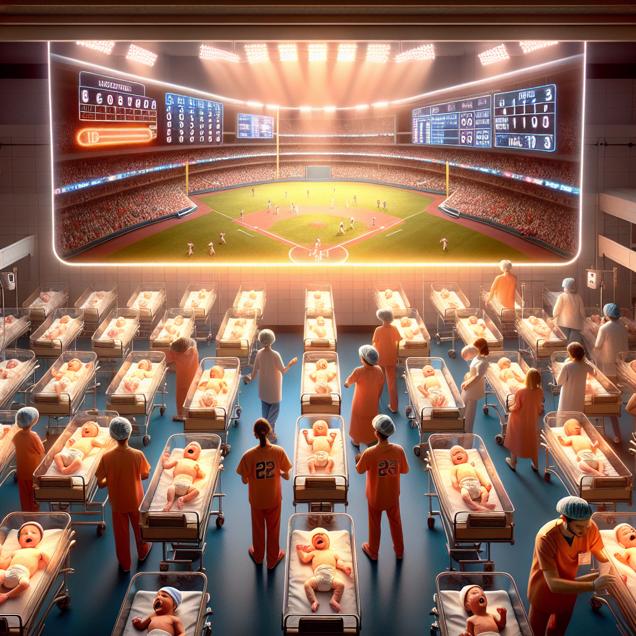 Prompt: [Raise the bar] Generate an image of a bustling hospital nursery filled with newborn babies named Destiny, while a glowing scoreboard featuring the Cleveland Guardians' logo illuminates the scene as the team's players hit back-to-back home runs, casting a warm reflection on the smiling faces of the babies. Capture the photorealistic essence of this enchanting fusion of new life and the excitement of baseball. The depiction should include only scenes, people, and objects, it should not include text or speech bubbles.