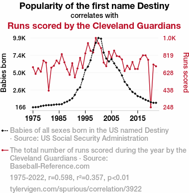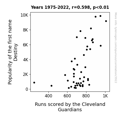 User prompt: Please provide potential search keywords for a paper titled Destiny's Child or Baseball Babe? The Name Destiny's Connection to Cleveland Guardians' Runs Scored with an abstract of In this study, we investigate the surprising relationship between the popularity of the first name "Destiny" and the runs scored by the Cleveland Guardians in Major League Baseball. Using data obtained from the US Social Security Administration and Baseball-Reference.com spanning 1975 to 2022, we applied statistical analysis to examine whether there is a significant correlation between the two variables. Our findings revealed a correlation coefficient of 0.5975301 and p < 0.01, suggesting a strong association between the prevalence of the name "Destiny" and the performance of the Cleveland Guardians on the baseball diamond. This unique intersection of etymology and athletics provides a novel perspective and challenges traditional perceptions of how the linguistic landscape may influence on-field outcomes.