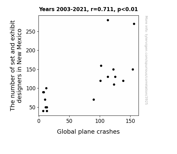 set and exhibit designers, plane crashes, correlation, New Mexico, aviation safety, Bureau of Labor Statistics, PlaneCrashInfo, correlation coefficient, p-value, 2003-2021, set design impact on aviation, causation vs correlation, art of design and science of aviation, aviation safety research