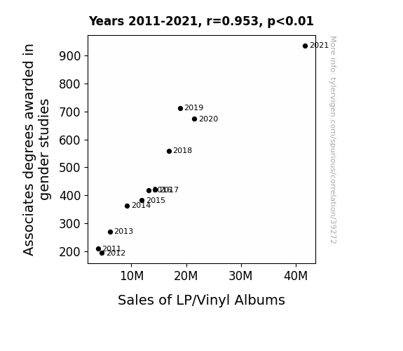 This means 90.9% of the change in the one variable (i.e., Sales of LP/Vinyl Albums) is predictable based on the change in the other (i.e., Associates degrees awarded in gender studies) over the 11 years from 2011 through 2021.