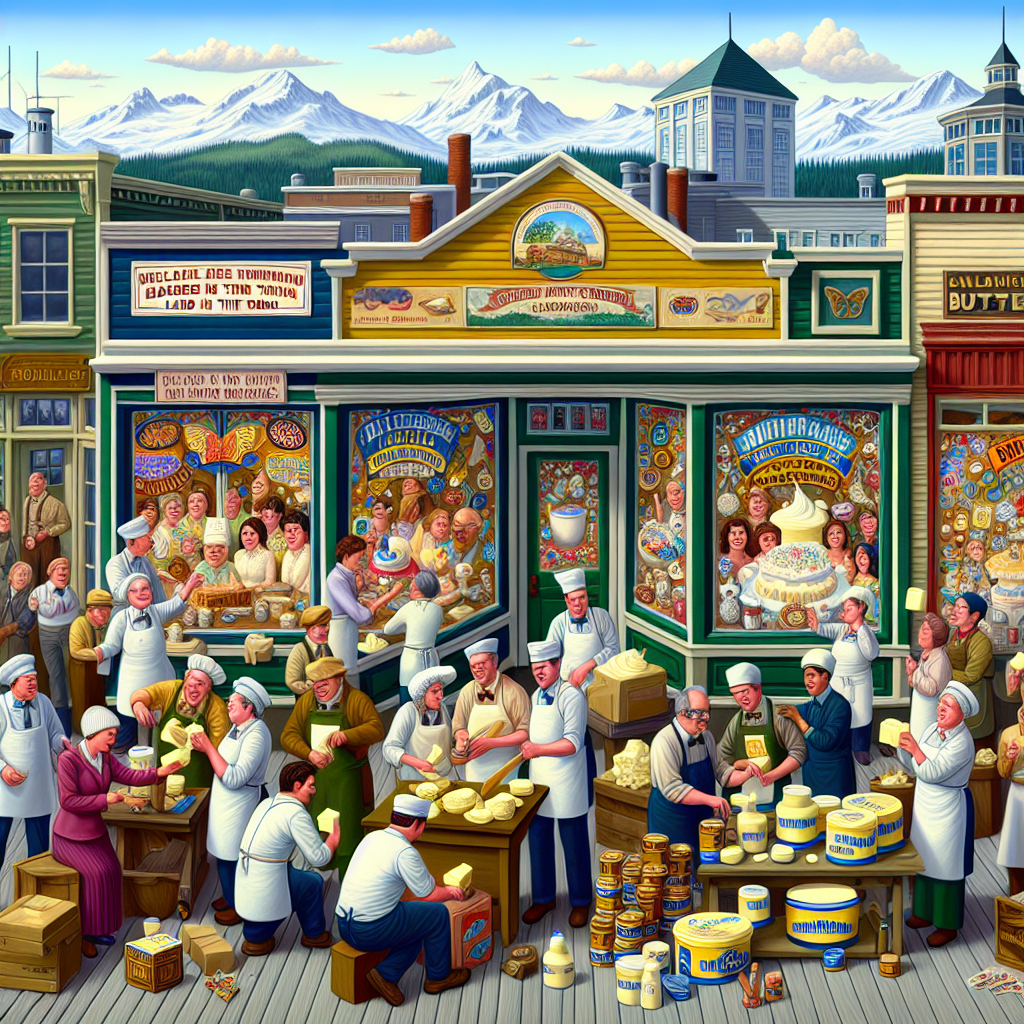 ChatGPT: Title: Dairy Wonderland Description: Create an image of a bustling town in Alaska, with colorful storefronts adorned with vibrant dairy-themed decorations. In the center of the town, a group of individuals skillfully arrange window displays, adding a touch of whimsy to the scene. Meanwhile, locals happily enjoy butter-laden treats, contributing to the need for window trimmers and displayers to ensure a "butter-tiful" and engaging display for all to savor. Render the scene in a cute and whimsical art style, emphasizing the vibrant dairy-themed decorations and the energetic atmosphere of the town.