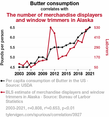 This means 65.3% of the change in the one variable (i.e., The number of merchandise displayers and window trimmers in Alaska) is predictable based on the change in the other (i.e., Butter consumption) over the 19 years from 2003 through 2021.