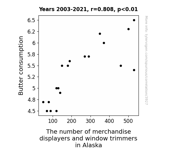 User prompt: Please make up a funny explanation for how an increase in Butter consumption caused The number of merchandise displayers and window trimmers in Alaska to increase.