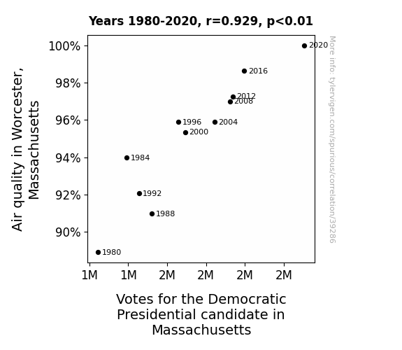 This means 86.2% of the change in the one variable (i.e., Votes for the Democratic Presidential candidate in Massachusetts) is predictable based on the change in the other (i.e., Air quality in Worcester, Massachusetts) over the 11 years from 1980 through 2020.