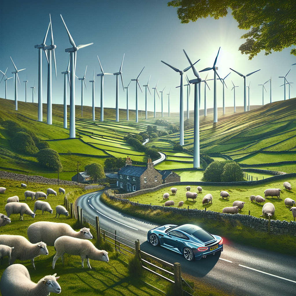 ChatGPT: [ Data cyber art ] Prompt: Create a vivid and futuristic scene of a serene landscape in the United Kingdom. Show a field of wind turbines towering over lush, rolling hills, their sleek blades spinning vigorously as they harness the power of the wind. Along a nearby country road, grazing sheep are drawn to the area by the increase in wind power, creating a peaceful and harmonious coexistence with the technology. In the distance, a sleek Mercedes-Benz is seen navigating the road cautiously, with a recall notice visible on its windshield, symbolizing the growing presence of sheep near roads and the accompanying rise in animal-related recalls. Capture the juxtaposition of nature, technology, and transportation in a visually stunning and thought-provoking manner.