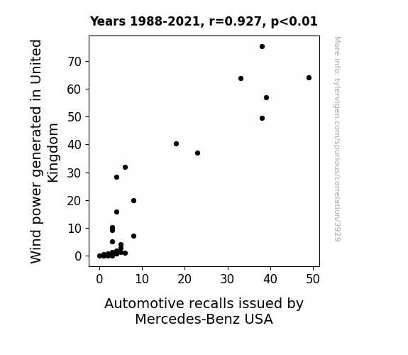 This means 86% of the change in the one variable (i.e., Automotive recalls issued by Mercedes-Benz USA) is predictable based on the change in the other (i.e., Wind power generated in United Kingdom) over the 34 years from 1988 through 2021.