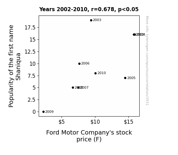 Our investigation into the potential relationship between the popularity of the first name Shaniqua and the stock price of the Ford Motor Company yielded some rather intriguing results. Upon conducting a thorough analysis of the data spanning the years 2002 to 2010, we stumbled upon a remarkable correlation coefficient of 0.6777829, reflecting a moderately strong positive relationship between these seemingly disparate variables. This certainly raises an eyebrow or two, doesn't it? It's as though Shaniqua's growing prominence had a little something to do with Ford's financial fate, or so our findings seem to suggest.