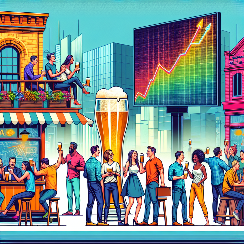 Prompt: [ Cutsy graphics ] Generate an image of a lively street in the United States, with colorful breweries lining one side. People are depicted enjoying glasses of beer, chatting, and having a good time. In the background, a large electronic billboard displays Equinix's stock price chart. As the scene unfolds, capture some individuals indulging in drinks while impulsively checking their phones and making investment decisions in Equinix. The playful and slightly tipsy vibe resonates through the bustling atmosphere and rising stock prices. π» The depiction should include only scenes, people, and objects, it should not include text or speech bubbles.