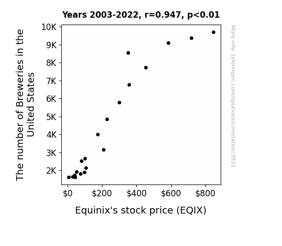 Our analysis un-brew-lingly reveals that as the number of breweries in the United States increased, Equinix's stock price also rose. This unexpected relationship highlights the importance of diversifying one's investment portfolio, as craft brewing trends appear to have a connection to the performance of a key player in the digital infrastructure industry. While this correlation may seem a-ale-ing at first, our rigorous statistical analysis confirms its significance, leaving readers with a taste for unusual market dynamics.