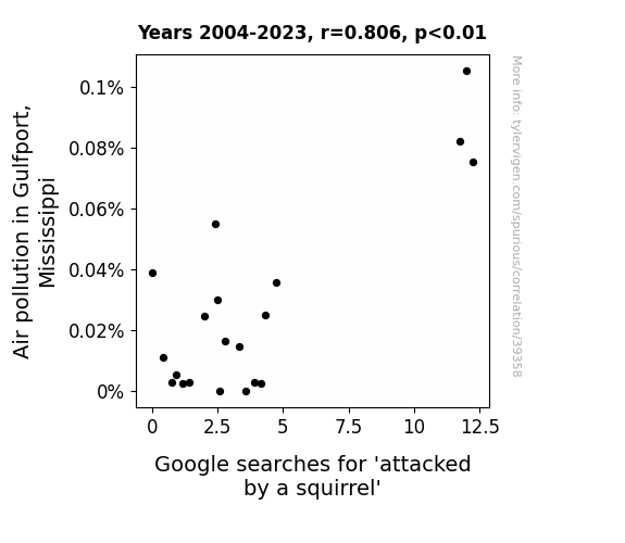 This means 64.9% of the change in the one variable (i.e., Google searches for 'attacked by a squirrel') is predictable based on the change in the other (i.e., Air pollution in Gulfport, Mississippi) over the 20 years from 2004 through 2023.