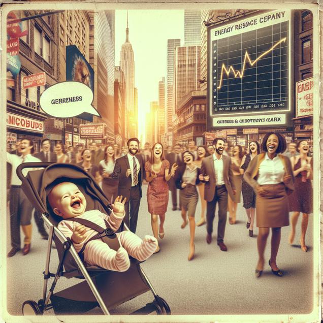 ChatGPT: In a bustling city, a baby named Micah giggles in his stroller as he's surrounded by a crowd of smiling people. Next to them, a large graph on a billboard shows the stock price of Canadian Natural Resources (CNQ) rising steadily. In the background, a line of people are eagerly buying microphones, with a store sign reading "High Demand for Microphones".