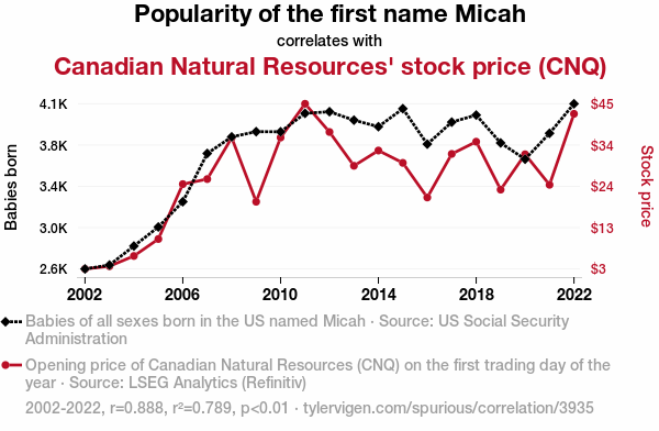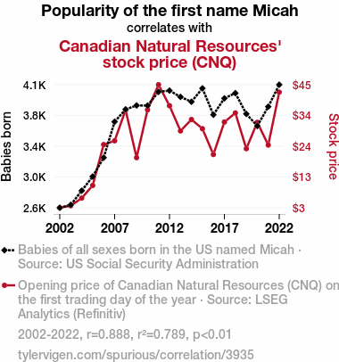 User prompt: Please provide potential search keywords for a paper titled Micah Mania: The Canadian Natural Resources-Rhyme Connection with an abstract of This groundbreaking research investigates the surprising link between the popularity of the first name Micah and the stock price of Canadian Natural Resources (CNQ). Leveraging data from the US Social Security Administration and LSEG Analytics (Refinitiv), our study dives into the uncharted waters of nomenclature and financial markets. Interestingly, we uncovered a striking correlation coefficient of 0.8883966 and p < 0.01 when examining the period from 2002 to 2022, shedding light on the niche yet significant influence of a name on stock prices.