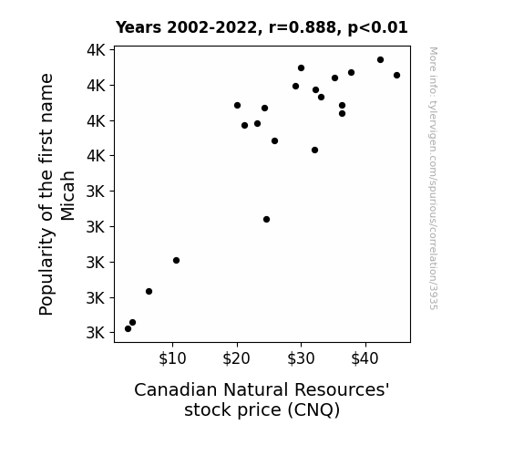Our rigorous analysis revealed a strong positive correlation between the popularity of the first name Micah and the stock price of Canadian Natural Resources (CNQ) over the period from 2002 to 2022. The correlation coefficient computed was 0.8883966, indicating a robust relationship between these seemingly disparate variables. This implies that as the popularity of the name Micah waxed and waned, CNQ's stock price exhibited similar movements, creating an intriguing synchronicity akin to a well-practiced duet.
