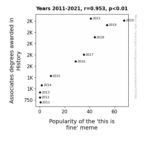 This means 90.8% of the change in the one variable (i.e., Popularity of the 'this is fine' meme) is predictable based on the change in the other (i.e., Associates degrees awarded in History) over the 11 years from 2011 through 2021.