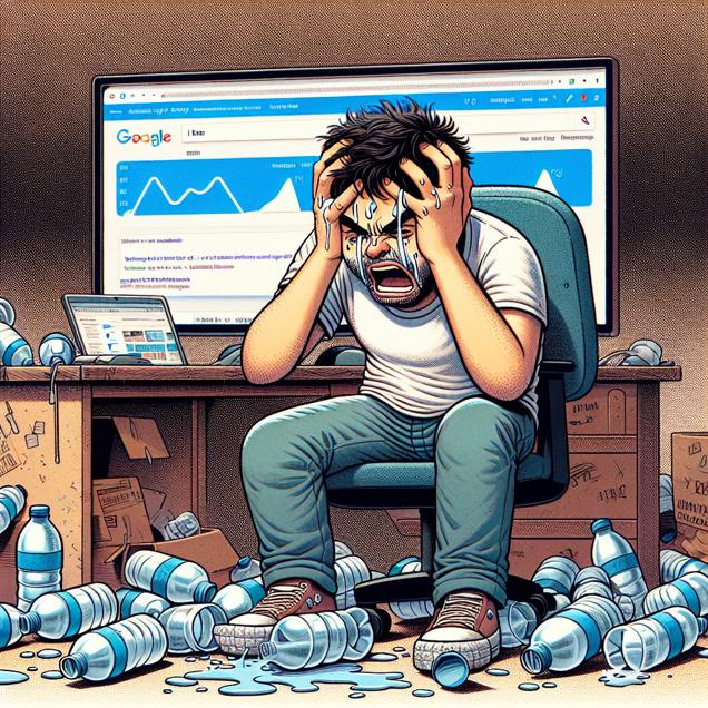 Prompt: Generate an image in the style of a meme where a person is sitting at a cluttered desk, amidst empty bottled water containers, holding their head in discomfort. On the computer screen, the Google search bar displays "i have a headache." In the background, a graph visually represents an upward trend in both bottled water consumption per person and Google searches for "i have a headache." Ensure the visual depiction is both relatable and thought-provoking. The depiction should include only scenes, people, and objects, it should not include text or speech bubbles.