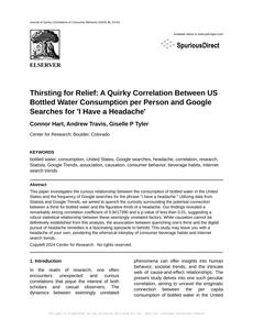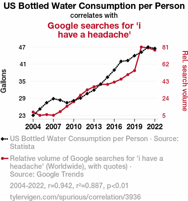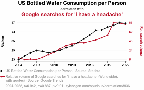 - The spurious research paper: Thirsting for Relief: A Quirky Correlation Between US Bottled Water Consumption per Person and Google Searches for 'I Have a Headache'
