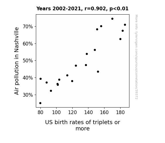 This means 81.3% of the change in the one variable (i.e., US birth rates of triplets or more) is predictable based on the change in the other (i.e., Air pollution in Nashville) over the 20 years from 2002 through 2021.