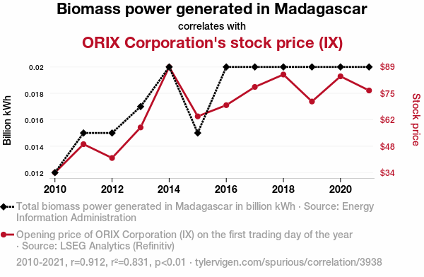 We flicked the switch on our analysis and found a shockingly strong correlation between Biomass power generation in Madagascar and the stock price of ORIX Corporation (IX). The correlation coefficient of 0.9116251 left us feeling positively charged, highlighting a robust relationship between these seemingly disparate entities. This finding suggests that the fluctuations in Biomass power generation in the exotic landscapes of Madagascar may indeed have a significant influence on the value of ORIX Corporation's stocks.