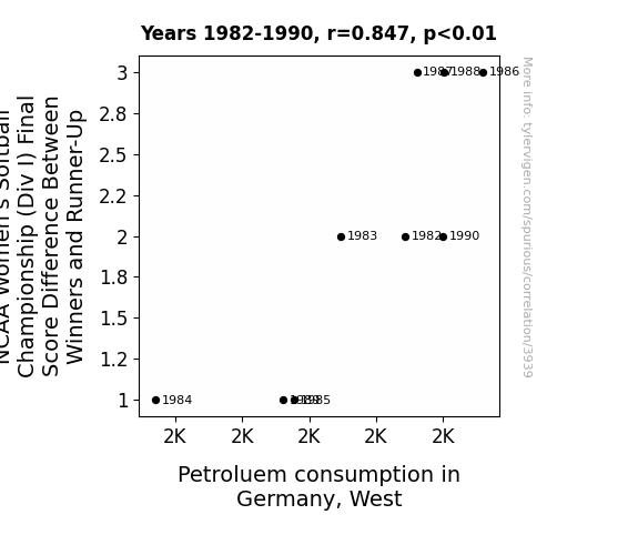 A linear line chart with years as the X-axis and two variables on the Y-axis. The first variable is NCAA Women's Softball Championship (Div I) Final Score Difference Between Winners and Runner-Up and the second variable is Petroluem consumption in Germany, West.  The chart goes from 1982 to 1990, and the two variables track closely in value over that time. Small Image
