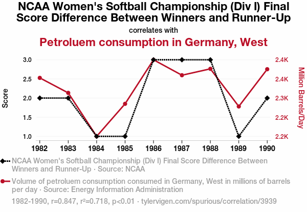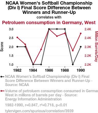 softball championship, NCAA Division I, final score differences, winners, runners-up, petroleum consumption, Germany, West, Energy Information Administration, correlation coefficient, fueling patterns, hidden link, interconnectedness, human activities