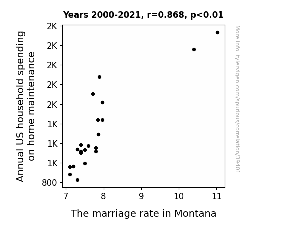 This means 75.4% of the change in the one variable (i.e., The marriage rate in Montana) is predictable based on the change in the other (i.e., Annual US household spending on home maintenance) over the 22 years from 2000 through 2021.