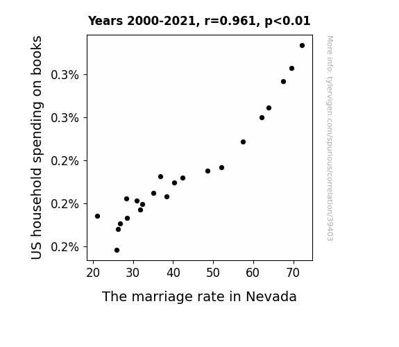This means 92.4% of the change in the one variable (i.e., The marriage rate in Nevada) is predictable based on the change in the other (i.e., US household spending on books) over the 22 years from 2000 through 2021.
