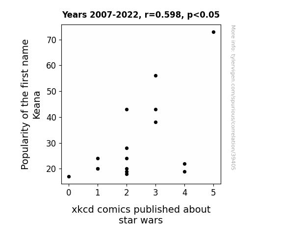This means 35.7% of the change in the one variable (i.e., xkcd comics published about star wars) is predictable based on the change in the other (i.e., Popularity of the first name Keana) over the 16 years from 2007 through 2022.