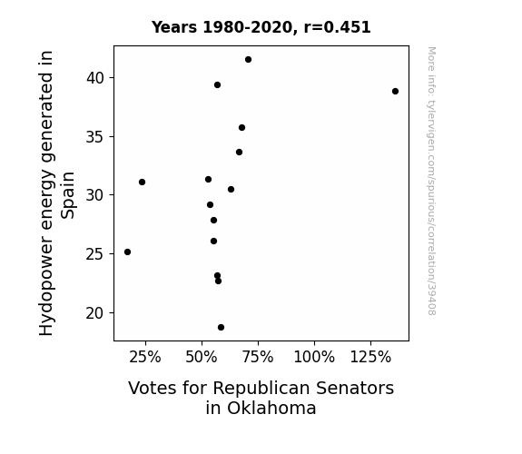 This means 20.4% of the change in the one variable (i.e., Votes for Republican Senators in Oklahoma) is predictable based on the change in the other (i.e., Hydopower energy generated in Spain) over the 15 years from 1980 through 2020.